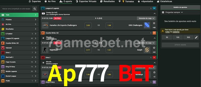 O Ap777 Bet oferece uma grande seleção de opções de apostas em e-sports com probabilidades competitivas